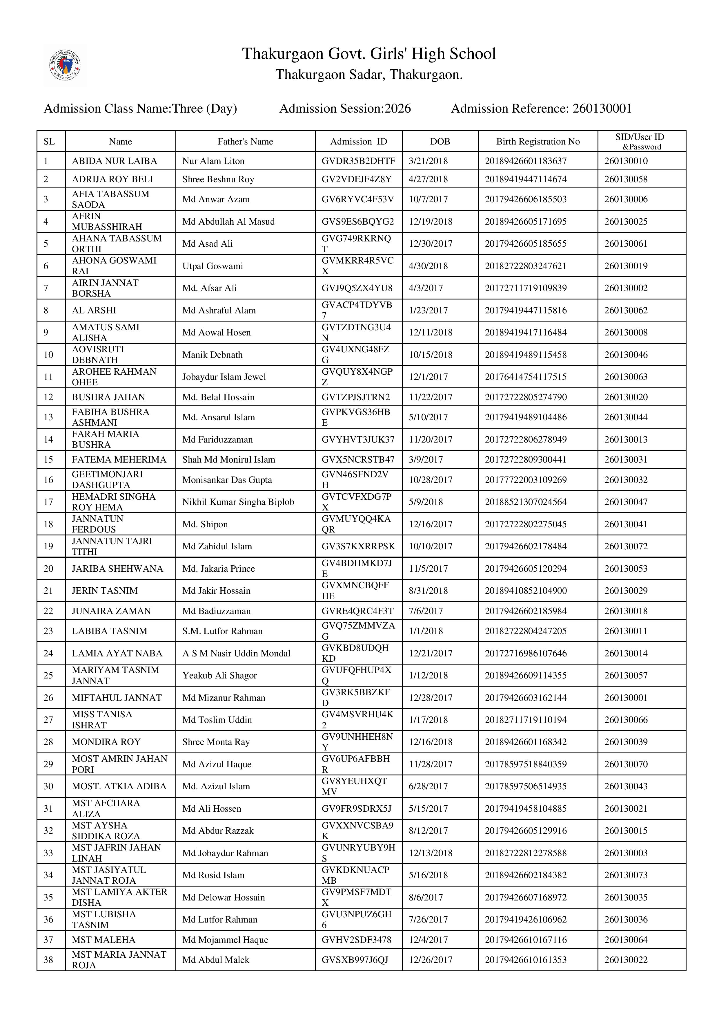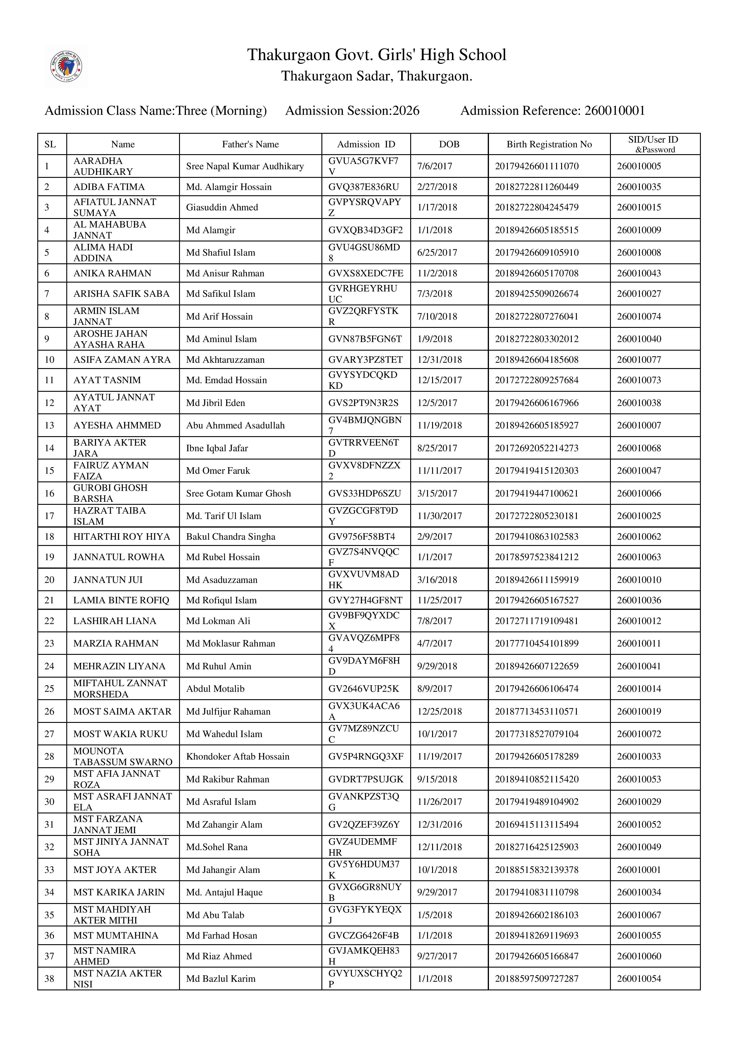 - ২০ডিসেম্বর২০২৫তৃতীয় শ্রেণিতে ভর্তি নির্বাচিত শিক্ষার্থীদের আইডি নম্বর